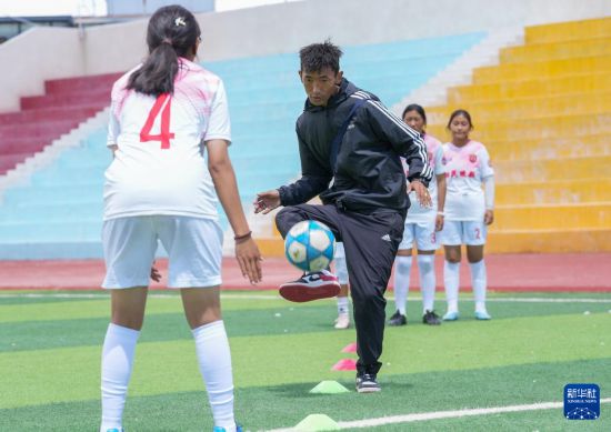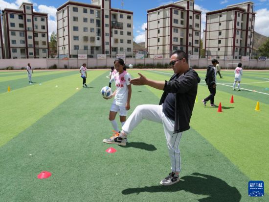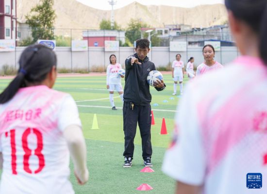 西藏日喀則市上海實(shí)驗(yàn)學(xué)校“珠峰雪鷹”女子足球隊(duì)教練洛布桑在操場(chǎng)上指導(dǎo)球員訓(xùn)練(9月3日攝)。新華社記者 丁汀 攝
