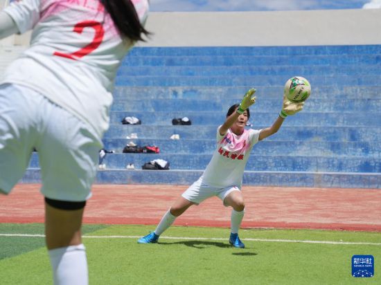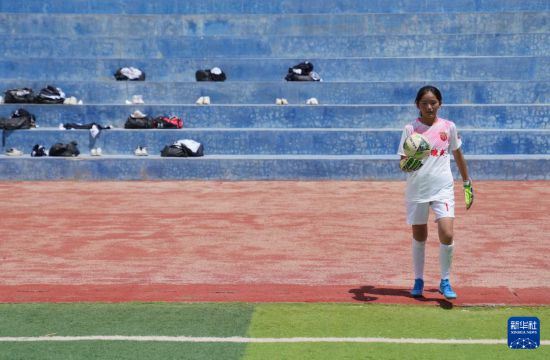在西藏日喀則市上海實(shí)驗(yàn)學(xué)校,“珠峰雪鷹”女子足球隊(duì)守門員邊普在操場(chǎng)上訓(xùn)練(9月3日攝)。|新華社記者 丁汀 攝