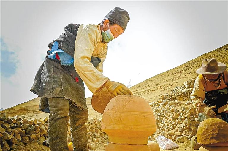 彭崗陶器制作工序繁復(fù),需歷經(jīng)取土、運(yùn)輸、粉碎、塑型、曬干、上水、燒制、成型、上漆(釉)等9道流程。僅取土環(huán)節(jié)便大有門道。年幼的桑珠緊隨舅舅,攀上海拔4475米的扎拉山山頂,在那處獨特土源地采擷優(yōu)質(zhì)黏土。