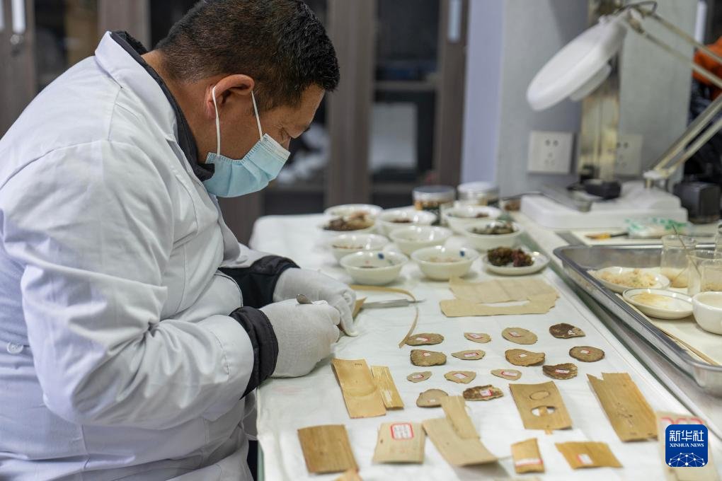 布達拉宮貝葉經(jīng)實驗性修復(fù)小組實驗室工作人員對貝葉進行處理(5月25日攝)。新華社記者 李賀 攝 ??