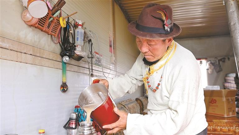 圖為日喀則市定結(jié)縣郭加鄉(xiāng)切村村民拉巴在用中央代表團(tuán)送來的酥油茶壺打酥油茶。本報(bào)通訊員 扎西卓嘎 攝