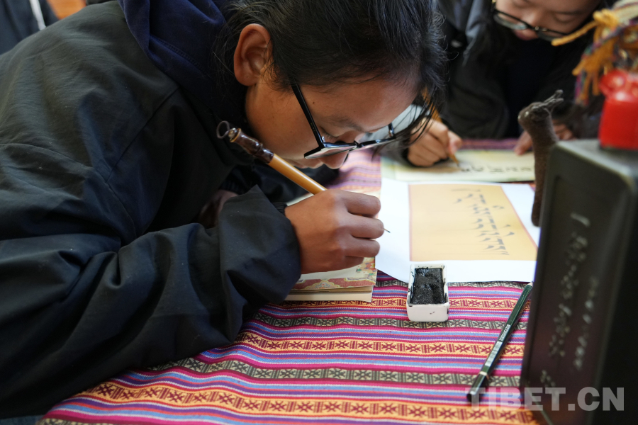圖為同學(xué)們手拿傳統(tǒng)竹筆跟藏族老師學(xué)寫藏文 攝影:趙佳