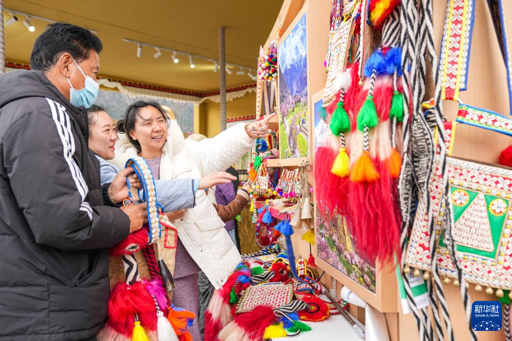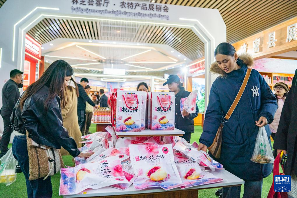 4月3日,游客在林芝市工布公園選購(gòu)當(dāng)?shù)靥禺a(chǎn)。新華社記者 丁增尼達(dá) 攝