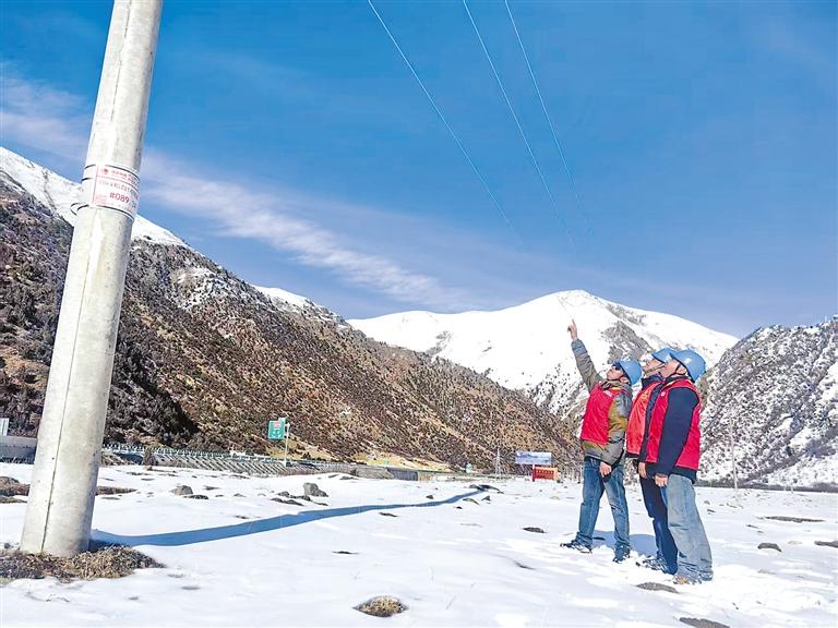 圖為國(guó)網(wǎng)工布江達(dá)縣供電公司工作人員在檢查線(xiàn)路。記者 劉楓 謝筱純 通訊員 多吉旺堆 張民澤 攝