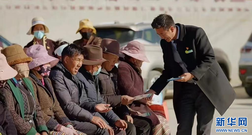 工作人員阿旺旦增為扎洞村群眾宣講金融知識(shí),并介紹“庭院經(jīng)濟(jì)貸”相關(guān)業(yè)務(wù)。(中國(guó)農(nóng)業(yè)銀行股份有限公司山南分行供圖)