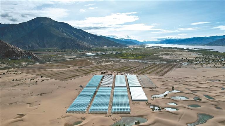 位于扎囊縣的國(guó)家農(nóng)業(yè)產(chǎn)業(yè)化示范企業(yè)——西藏綠之源現(xiàn)代農(nóng)業(yè)科技股份有限公司二期項(xiàng)目,如同一片“綠洲”鑲嵌在沙丘之中。記者 丹增平措 攝