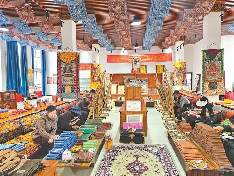 黨建引領(lǐng),產(chǎn)業(yè)提質(zhì)。在當(dāng)?shù)攸h委、政府的大力扶持下,政策引導(dǎo)、資金注入、平臺(tái)搭建等利好舉措相繼落地。短短4年間,貢覺縣桑珠榮村一處不起眼的廠房華麗轉(zhuǎn)身,變?yōu)樯V闃s村民族手工業(yè)孵化基地,堤無瑪藝術(shù)傳承合作社也應(yīng)運(yùn)而生,成為該村的集體經(jīng)濟(jì)組織。