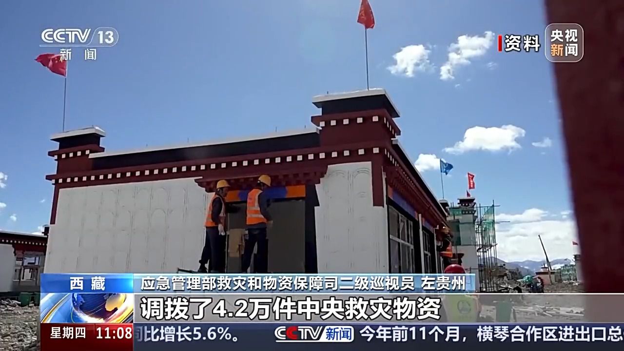 應(yīng)急管理部救災(zāi)和物資保障司二級巡視員 左貴州:針對定日地震,國家防減救災(zāi)委協(xié)調(diào)下?lián)芰?4億中央救災(zāi)資金,調(diào)撥了4.2萬件中央救災(zāi)物資,并啟動了應(yīng)急物資保障政社協(xié)同機制,調(diào)撥一大批生活類的物資,確保受災(zāi)群眾盡快恢復(fù)家園、溫暖過冬。