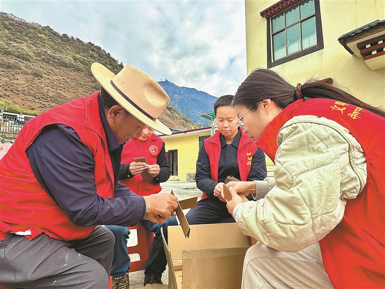 圖為墨脫縣格當鄉(xiāng)黨員干部幫助村民制作包裝盒。記者 王敏 通訊員 郎玲 攝