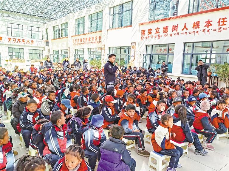 “辦理邊境通行證需要哪些材料?”“遭遇家暴、校園霸凌該怎么求助?”在堆納鄉(xiāng)中心小學(xué)的法治課堂上,民警澤成朗加正為孩子們講解未成年人保護(hù)法。這是該所“八五”普法宣傳的生動一幕。