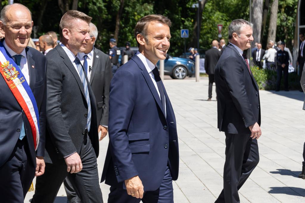 6月9日,在法國勒圖凱市一處投票站外,法國總統(tǒng)馬克龍(前)在參加歐洲議會(huì)選舉投票前與民眾交流。 新華社發(fā)(弗蘭克·博阿姆攝)