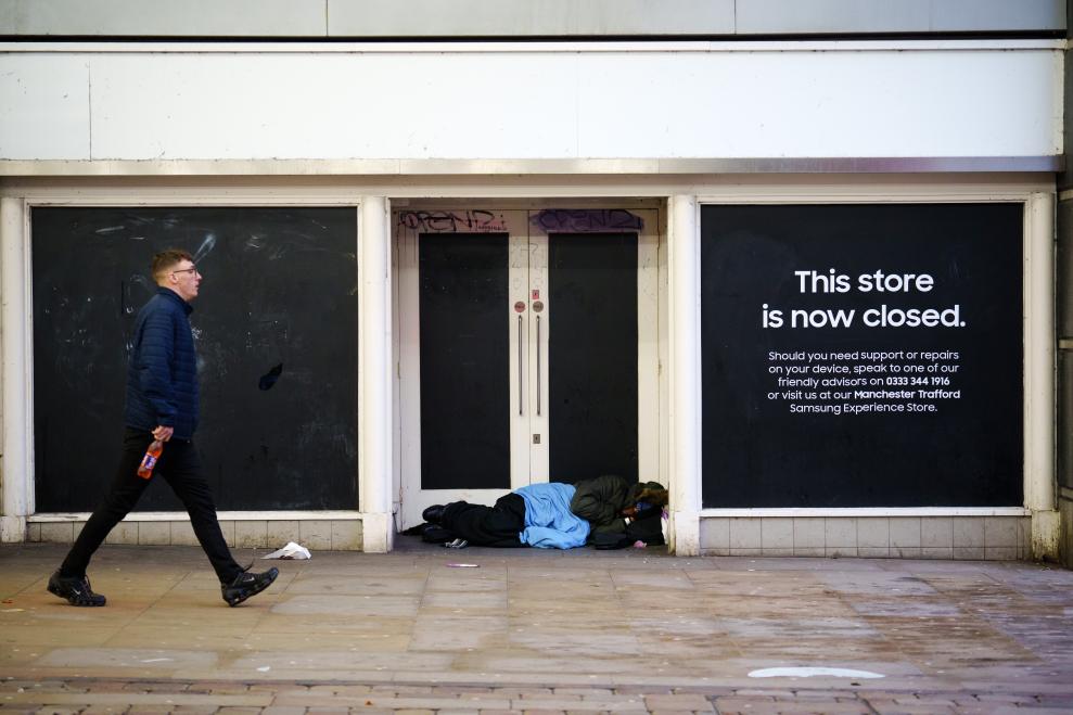 2023年11月22日,在英國曼徹斯特,一名無家可歸者躺在一家關(guān)閉的店鋪前。新華社發(fā)(喬恩·休珀攝)