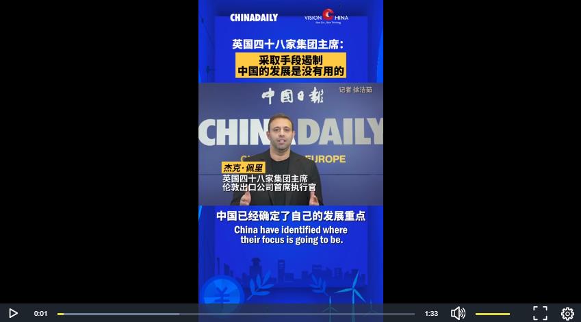 12月5日,由中國日報社主辦、對外經(jīng)濟貿(mào)易大學(xué)協(xié)辦的“新時代大講堂”活動在北京舉行。英國四十八家集團主席、倫敦出口公司CEO杰克·佩里在視頻演講中提到“對中國發(fā)展采取遏制手段是沒有用的”,他說“中國的各種活動和博覽會邀請了所有人,沒有誰會被中國拒之門外”。