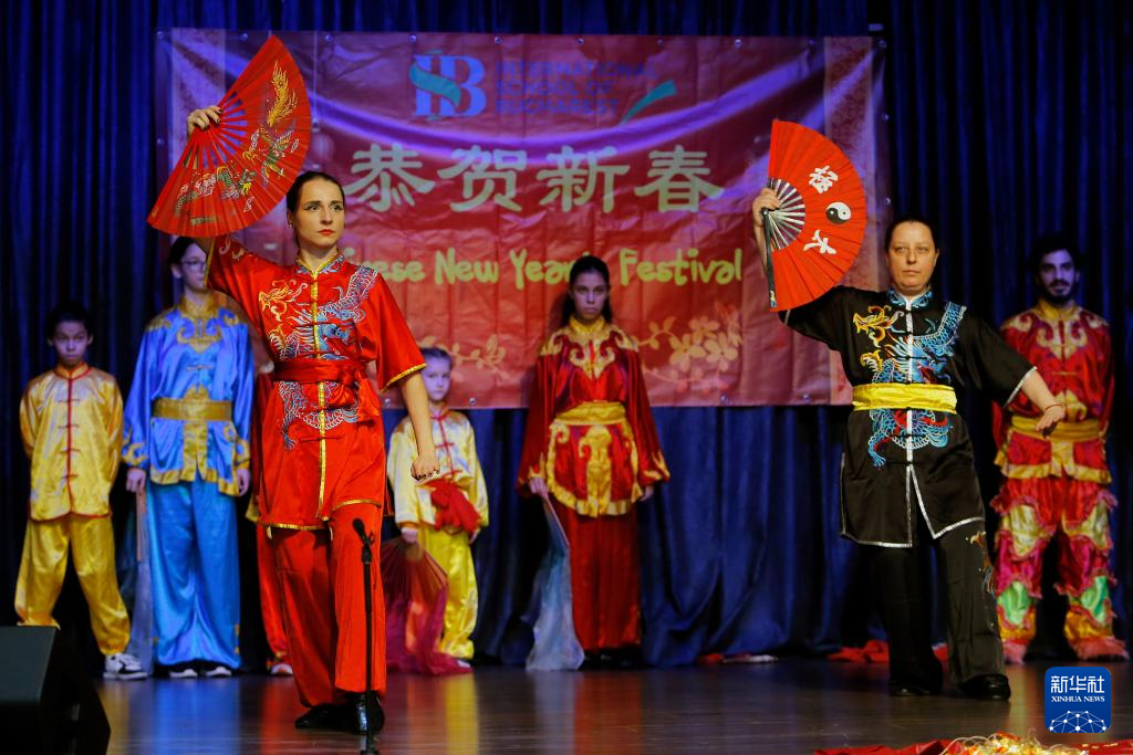 1月31日,在羅馬尼亞布加勒斯特國際學校,羅馬尼亞武術(shù)愛好者在新春聯(lián)歡會上表演。新華社發(fā)(克里斯泰爾攝)