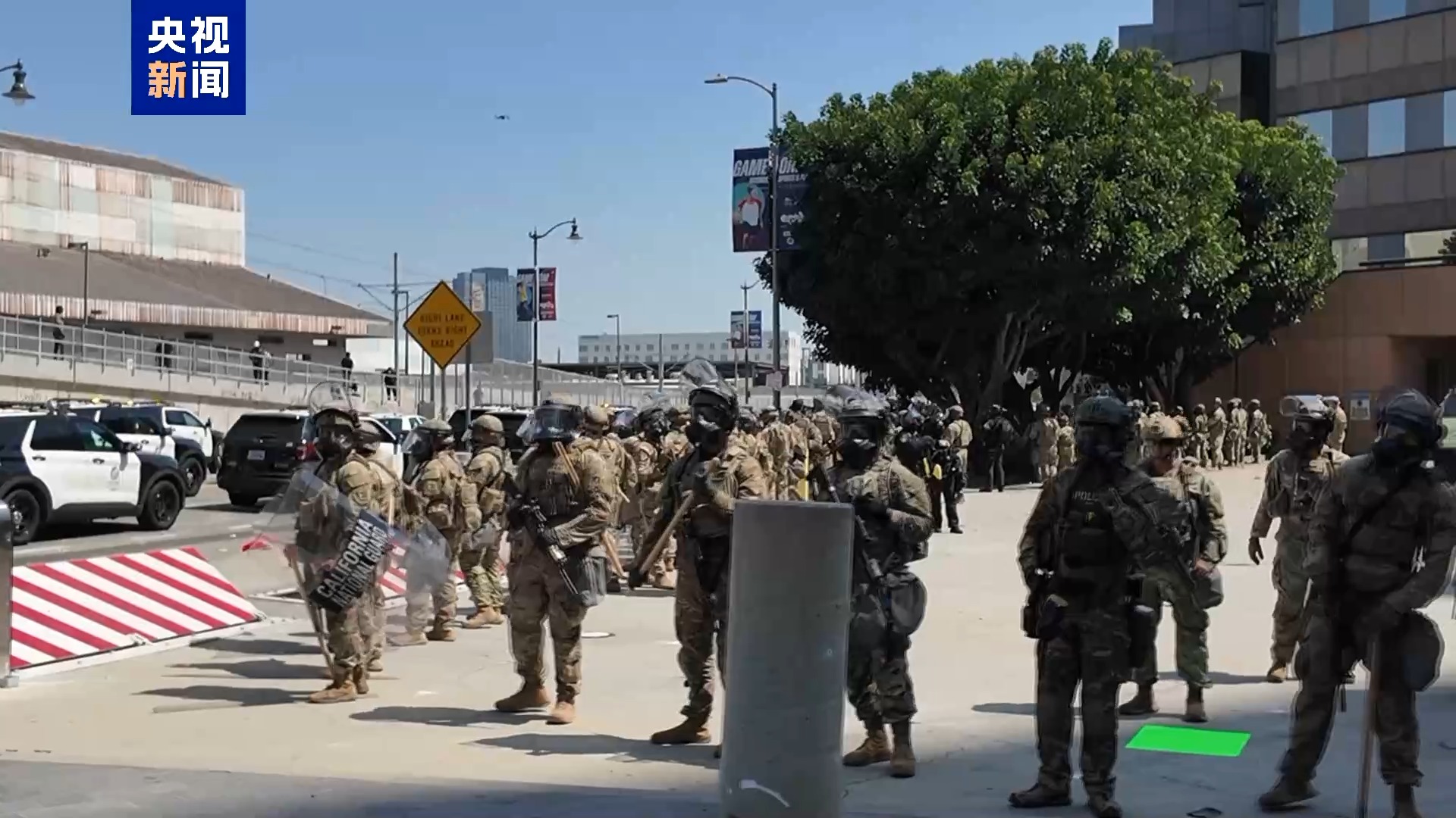 央視記者 劉驍騫:同時(shí),美國國民警衛(wèi)隊(duì)已部署在現(xiàn)場(chǎng)。這些荷槍實(shí)彈穿著迷彩服的士兵就是特朗普政府部署的國民警衛(wèi)隊(duì)隊(duì)員,他們?cè)趲讉€(gè)小時(shí)前,也就是當(dāng)?shù)貢r(shí)間8日上午入駐到這里。根據(jù)官方消息,目前已經(jīng)有至少300名國民警衛(wèi)隊(duì)隊(duì)員抵達(dá)洛杉磯。