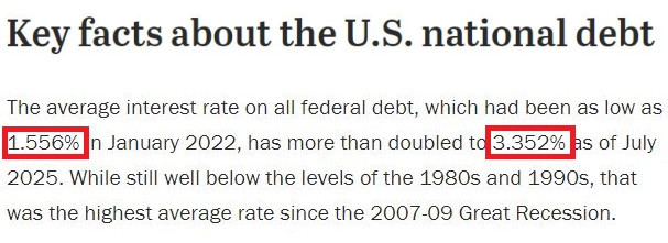 △美國(guó)皮尤研究中心的調(diào)查顯示,美聯(lián)邦債務(wù)的平均利率在美聯(lián)儲(chǔ)激進(jìn)加息前的2022年1月曾低至1.556%,而到今年7月已翻了一倍多,達(dá)到3.352%,也是自2007-2009年大衰退以來(lái)的最高平均利率水平。