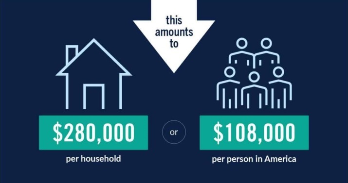 彼得森基金會(huì)給出驚人結(jié)果:如果將債務(wù)分?jǐn)偨o美國(guó)民眾,相當(dāng)于每戶家庭負(fù)債28萬(wàn)美元,每個(gè)人負(fù)債10.8萬(wàn)美元。