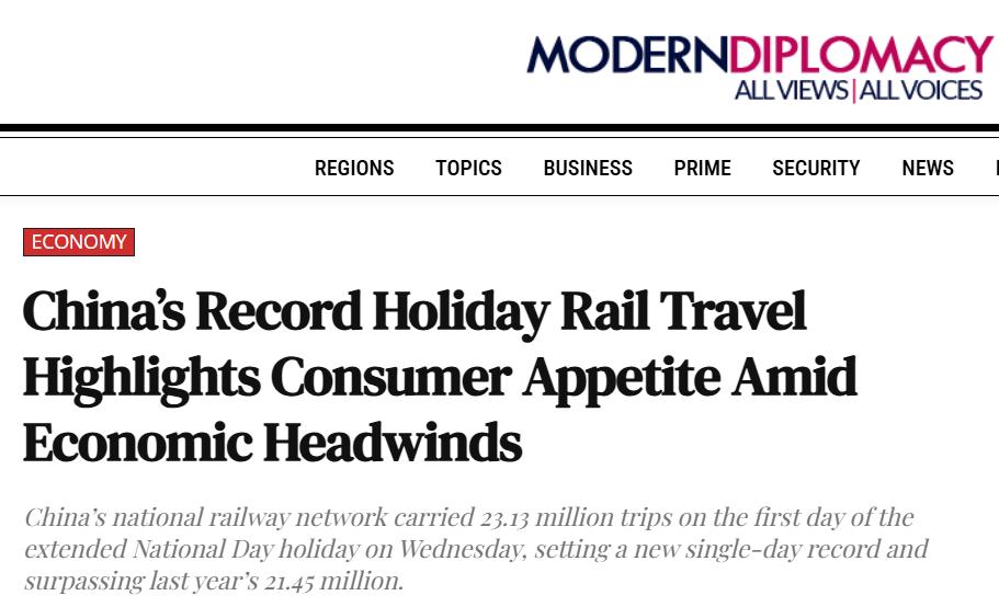 歐洲《現(xiàn)代外交》(Modern Diplomacy)網(wǎng)站報(bào)道注意到,中國國慶中秋“超長黃金周”首日,全國鐵路發(fā)送旅客2313萬人次,創(chuàng)下單日歷史新高。報(bào)道援引官方預(yù)測稱,整個(gè)八天假期出行總量預(yù)計(jì)將達(dá)23.6億人次,日均出行近3億人,堪稱“史上最忙假期”。