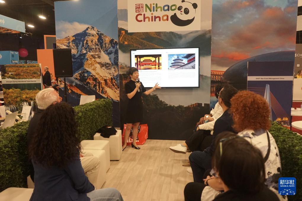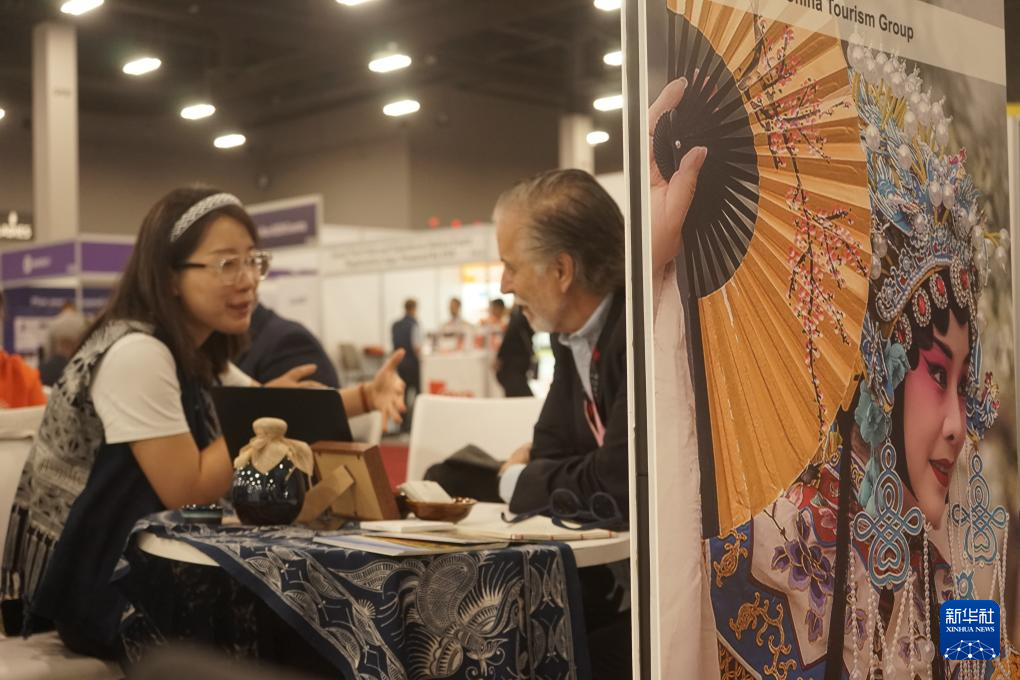 10月8日,在美國(guó)拉斯維加斯,參觀者在2025年美國(guó)國(guó)際會(huì)議與獎(jiǎng)勵(lì)旅游展的中國(guó)展區(qū)傾聽(tīng)講解。 新華社發(fā)(曾慧攝)