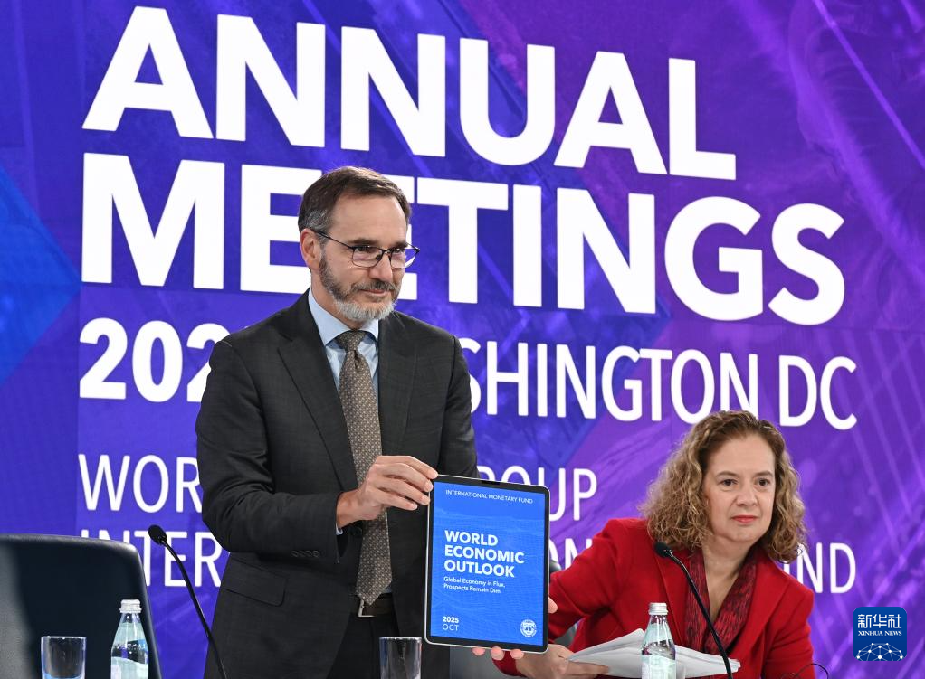 10月14日,在美國華盛頓,國際貨幣基金組織首席經(jīng)濟學(xué)家皮埃爾-奧利維耶·古蘭沙(左)在《世界經(jīng)濟展望報告》新聞發(fā)布會上展示報告。新華社記者 李睿 攝