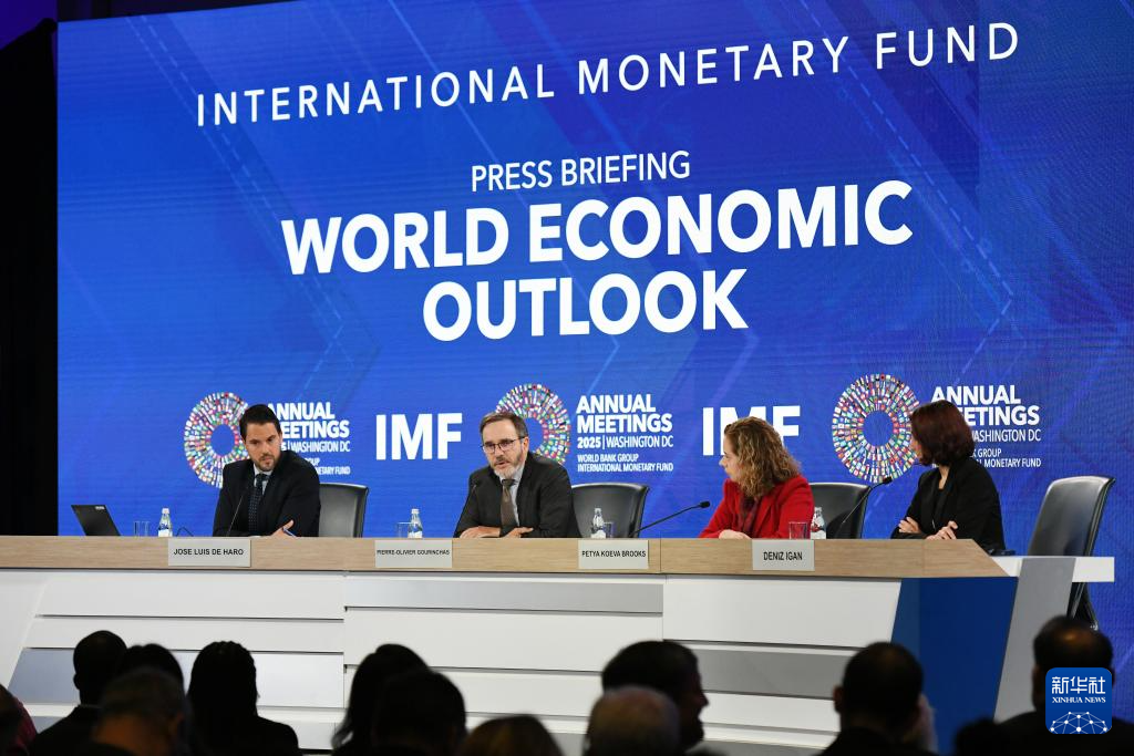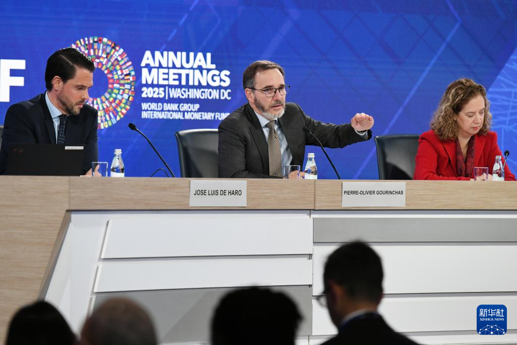 10月14日,在美國華盛頓,國際貨幣基金組織首席經(jīng)濟學(xué)家皮埃爾-奧利維耶·古蘭沙(中)在《世界經(jīng)濟展望報告》新聞發(fā)布會上講話。新華社記者 李睿 攝