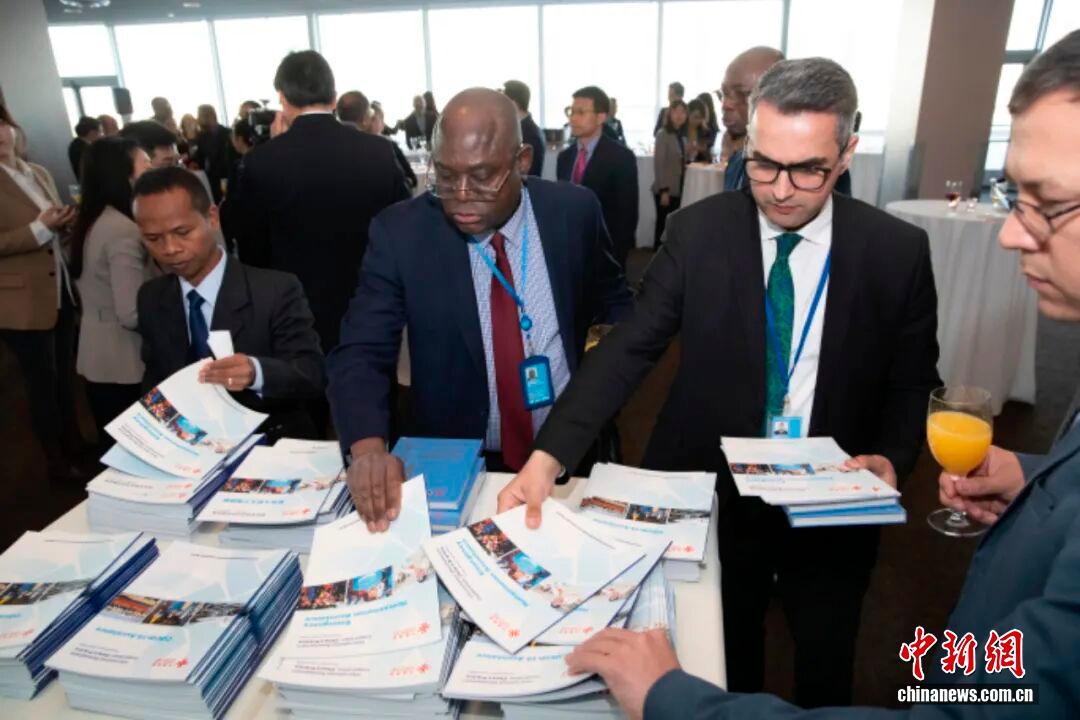 當?shù)貢r間2023年4月19日,“全球發(fā)展倡議新進展可持續(xù)發(fā)展議程新行動”主題展覽在紐約聯(lián)合國總部舉行。圖為與會嘉賓取閱國合署發(fā)布的新報告——《國際發(fā)展合作的中國實踐》。 中新社記者 廖攀 攝