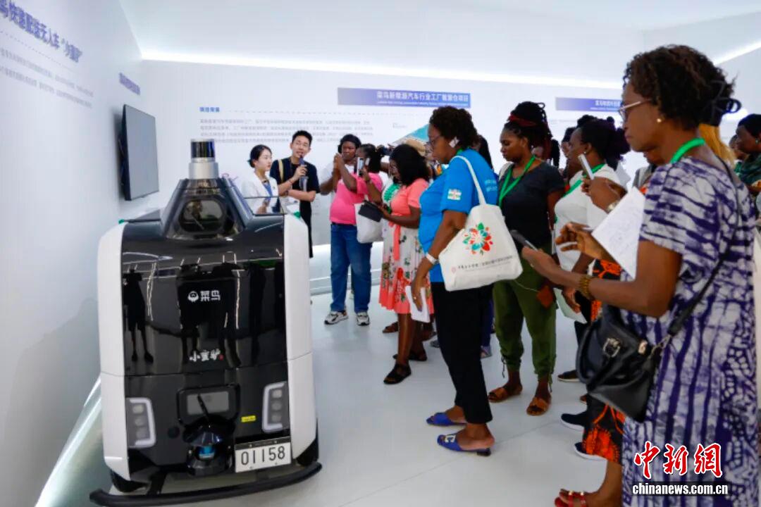 2025年9月16日,中非婦女官員能力建設研修班的25名學員來到杭州的中國人工智能小鎮(zhèn)。圖為研修班成員參觀快遞配送無人車。 中新社記者 肖健 攝