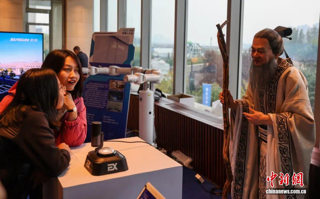 2025年10月17日,2025沈陽機器人大會在遼寧沈陽開幕。圖為觀眾與交互型仿生人形機器人孔子互動。 中新社記者 于海洋 攝