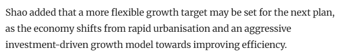 《南華早報(bào)》援引分析人士的表述認(rèn)為,隨著中國經(jīng)濟(jì)從快速城鎮(zhèn)化和投資驅(qū)動(dòng)型增長模式轉(zhuǎn)向高質(zhì)量發(fā)展,中國下一個(gè)五年規(guī)劃可能會(huì)設(shè)定更靈活的增長目標(biāo)。