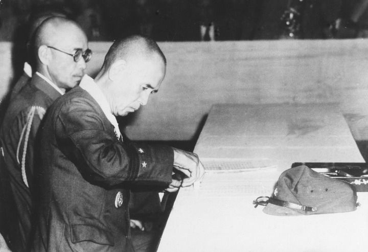 1945年9月9日,南京舉行中國戰(zhàn)區(qū)日軍投降儀式,侵華日軍總司令岡村寧次代表日軍簽署投降書。新華社發(fā)