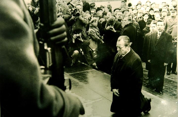 1970年12月7日,聯(lián)邦德國總理勃蘭特在波蘭首都華沙猶太人殉難紀念碑前下跪。新華社發(fā)
