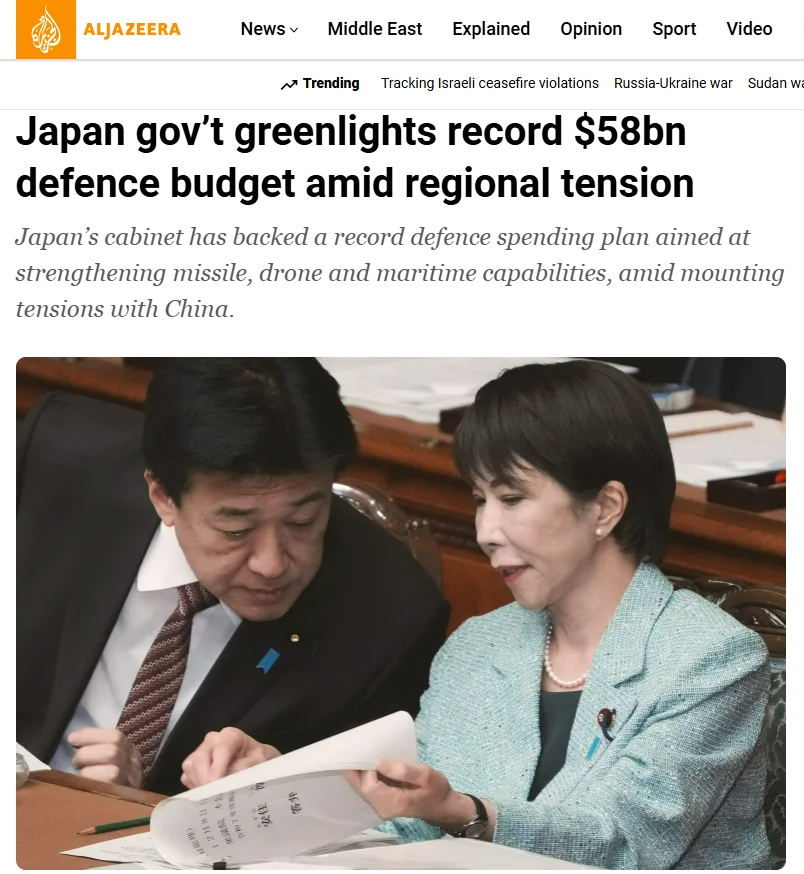 日本政府12月26日批準(zhǔn)2026財(cái)年(2026年4月至2027年3月)預(yù)算案,其中防衛(wèi)預(yù)算超9萬(wàn)億日元,再創(chuàng)歷史新高。其展現(xiàn)出的日本負(fù)面軍事動(dòng)向,受到國(guó)際媒體關(guān)注。