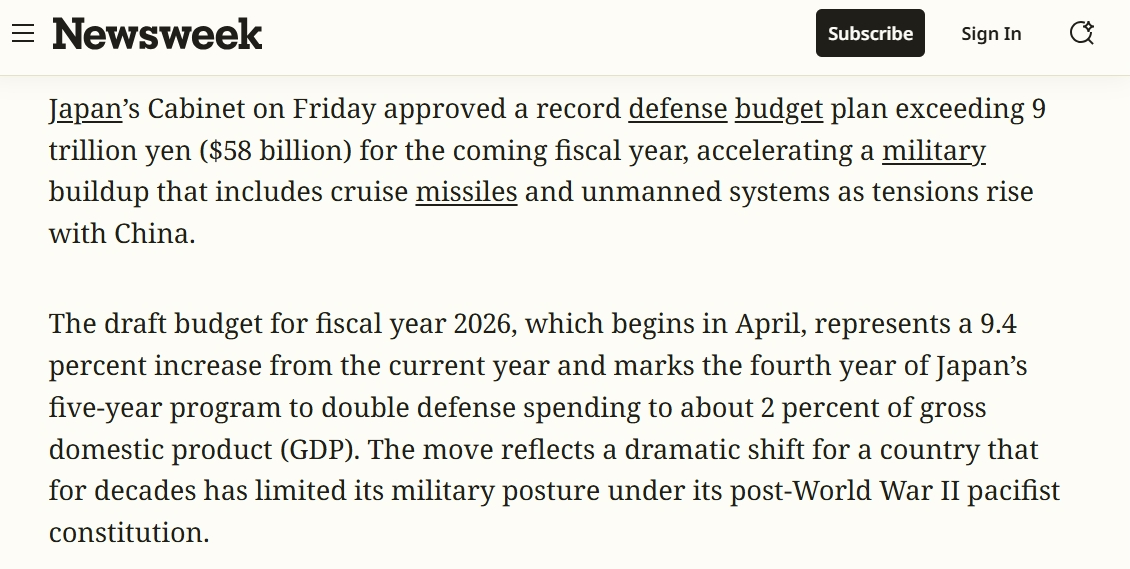 美國(guó)《新聞周刊》的報(bào)道稱,日本2026財(cái)年防衛(wèi)預(yù)算比今年增加了9.4%。新預(yù)算的一個(gè)重點(diǎn)是加強(qiáng)日本“遠(yuǎn)距離打擊敵方目標(biāo)的能力”,這大大偏離了日本長(zhǎng)期以來(lái)嚴(yán)格限制使用武力用于自衛(wèi)的原則。