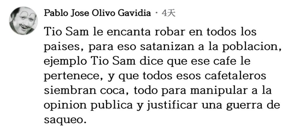 網(wǎng)友巴勃羅·奧利沃留言說:“山姆大叔喜歡在所有國家盜竊,為此他們妖魔化民眾,譬如山姆大叔說那片咖啡園是屬于他的,還說所有那些咖啡農(nóng)在種植古柯,所有這一切都是為了操弄輿論,為了給他們的掠奪戰(zhàn)爭辯護(hù)。”