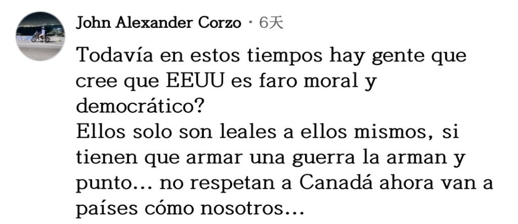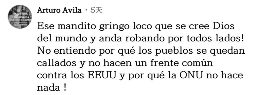網(wǎng)友阿爾圖羅·阿維拉表達(dá)不解:“美國自以為是世界之神,到處掠奪!我不明白為什么各國人民依然保持沉默,而不是組成一個共同陣線對抗美國?!?/p>