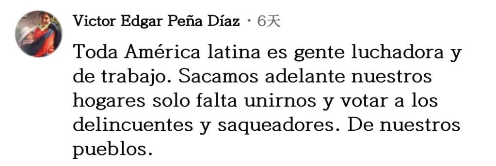 網(wǎng)友維克托·培尼亞留言說:“所有拉美人民都是勞動者和奮斗者,我們靠自己的努力養(yǎng)家糊口?,F(xiàn)在只差團(tuán)結(jié)起來,把那些掠奪我們的罪犯和強盜趕跑?!?/p>