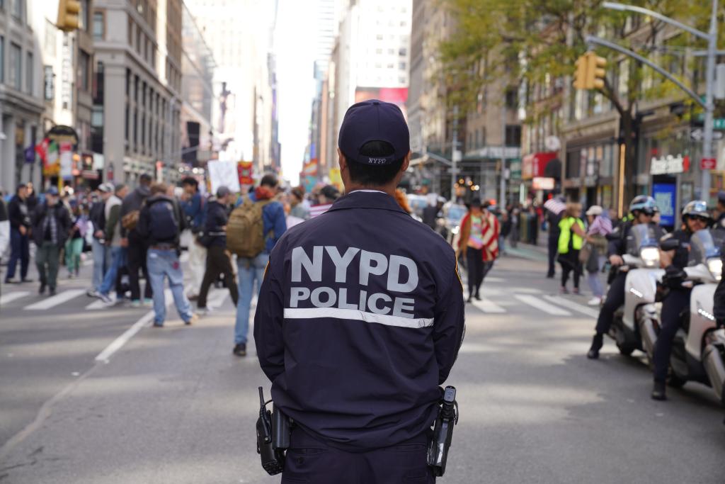 2025年10月18日,在美國紐約,警察在示威游行活動(dòng)現(xiàn)場(chǎng)執(zhí)勤。新華社記者張鳳國攝