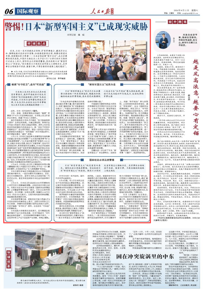 日本《赤旗報(bào)》社論指出,2026年是反對(duì)大規(guī)模強(qiáng)軍擴(kuò)武的關(guān)鍵之年,政府的擴(kuò)武計(jì)劃不僅威脅和平,也損害日本國(guó)民的生活。