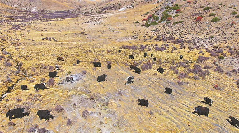 墨竹工卡縣日多鄉(xiāng)拉龍村4組的牧場(chǎng)上,牦牛在悠閑地吃草。記者 格桑倫珠 攝