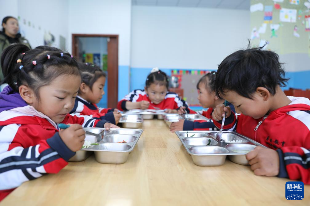 扎嘎新村幼兒園學(xué)生正在吃午飯。新華社發(fā)(嘉措 攝)