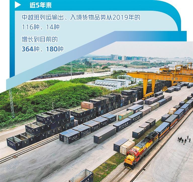 數(shù)據(jù)表明,高效、實(shí)惠、便捷的中越班列已得到市場認(rèn)可。近5年來,中越班列運(yùn)輸出、入境貨物品類從2019年的116種、14種,增長到目前的364種、180種。中越班列集貨地已覆蓋廣西及周邊省份20多個地市,跨境貨物運(yùn)輸覆蓋越南、老撾、泰國等多個東盟國家。