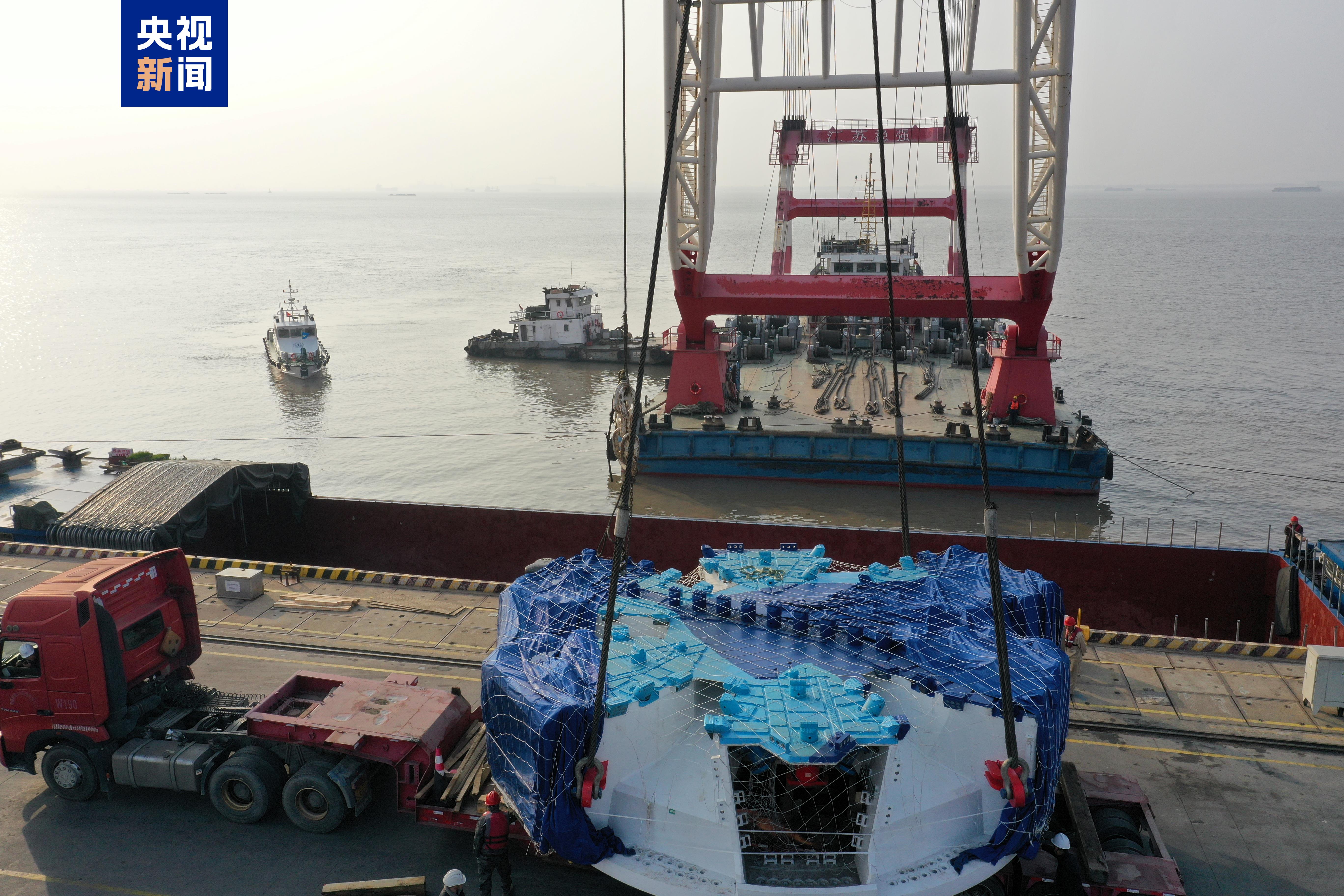 今天(12月3日)9時(shí)許,海太長(zhǎng)江隧道盾構(gòu)機(jī)“江海號(hào)”的刀盤中心塊運(yùn)抵江蘇南通海門吊裝上岸,通過水陸聯(lián)運(yùn)的方式進(jìn)入施工現(xiàn)場(chǎng)。