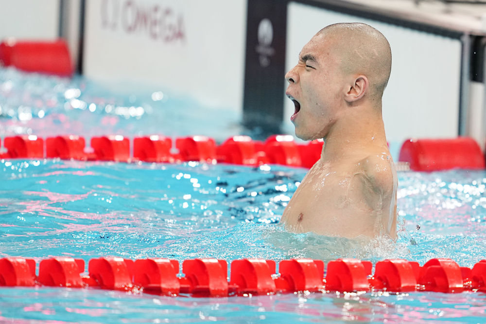 巴黎殘奧會游泳男子50米蝶泳S5級決賽,郭金城在打破世界紀(jì)錄后慶祝。新華社記者 熊琦 攝