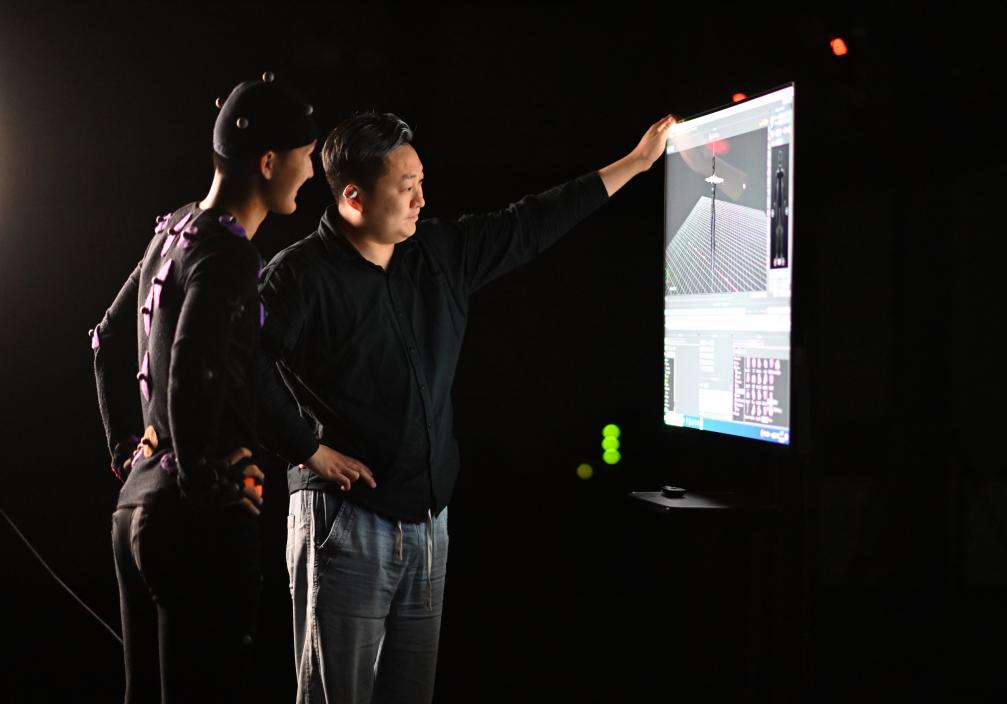 2024年4月23日,數(shù)字孿生應(yīng)用技術(shù)員崔盛輯(右)和同事在查看電腦生成的虛擬角色動(dòng)作。新華社記者 趙子碩 攝