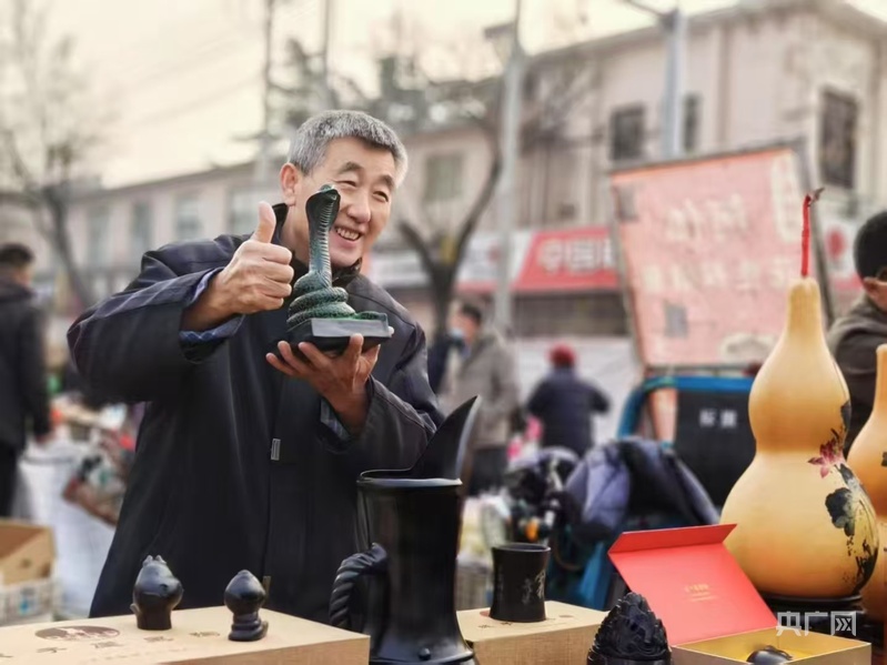 非遺項目章丘黑陶傳承人張國慶展示蛇年擺件(央廣網(wǎng)發(fā) 孟凡庚 攝)