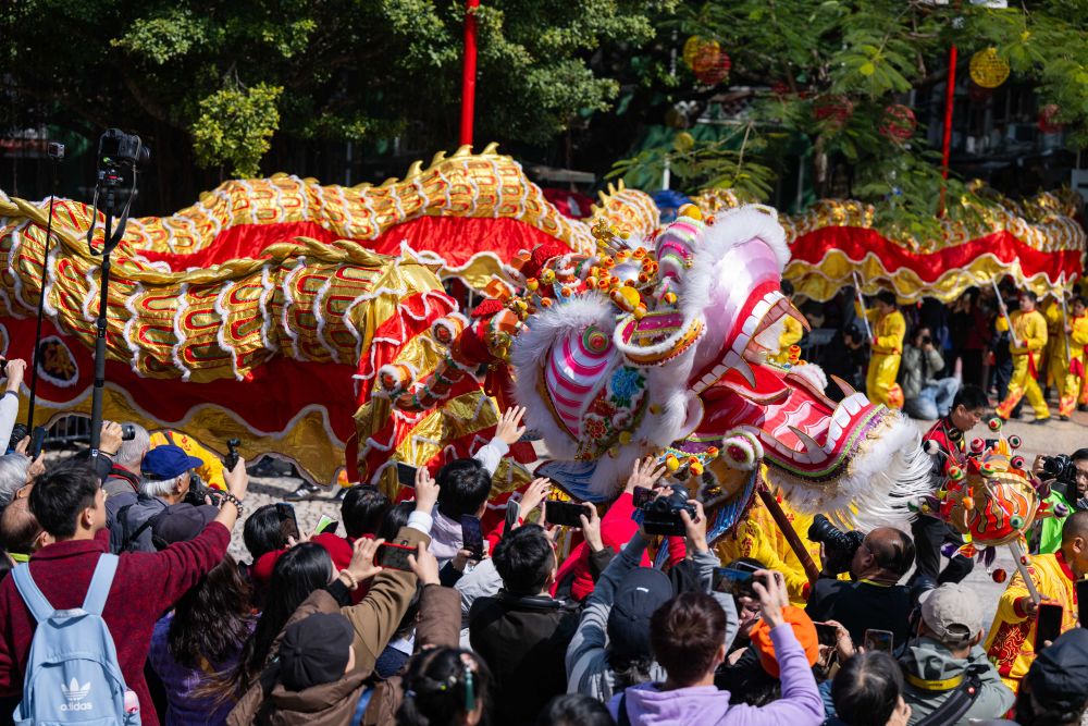 金龍啟新歲,萬事皆順遂?!皻g樂春節(jié)——2025年龍騰舞躍賀新春”社區(qū)巡演于29日上午11時在大三巴牌坊舉行點睛儀式。238米長的大金龍及18頭醒獅,聯(lián)同“財神”“福、祿、壽三星”“金童玉女”及澳門旅游吉祥物“麥麥”向澳門居民和旅客拜年。