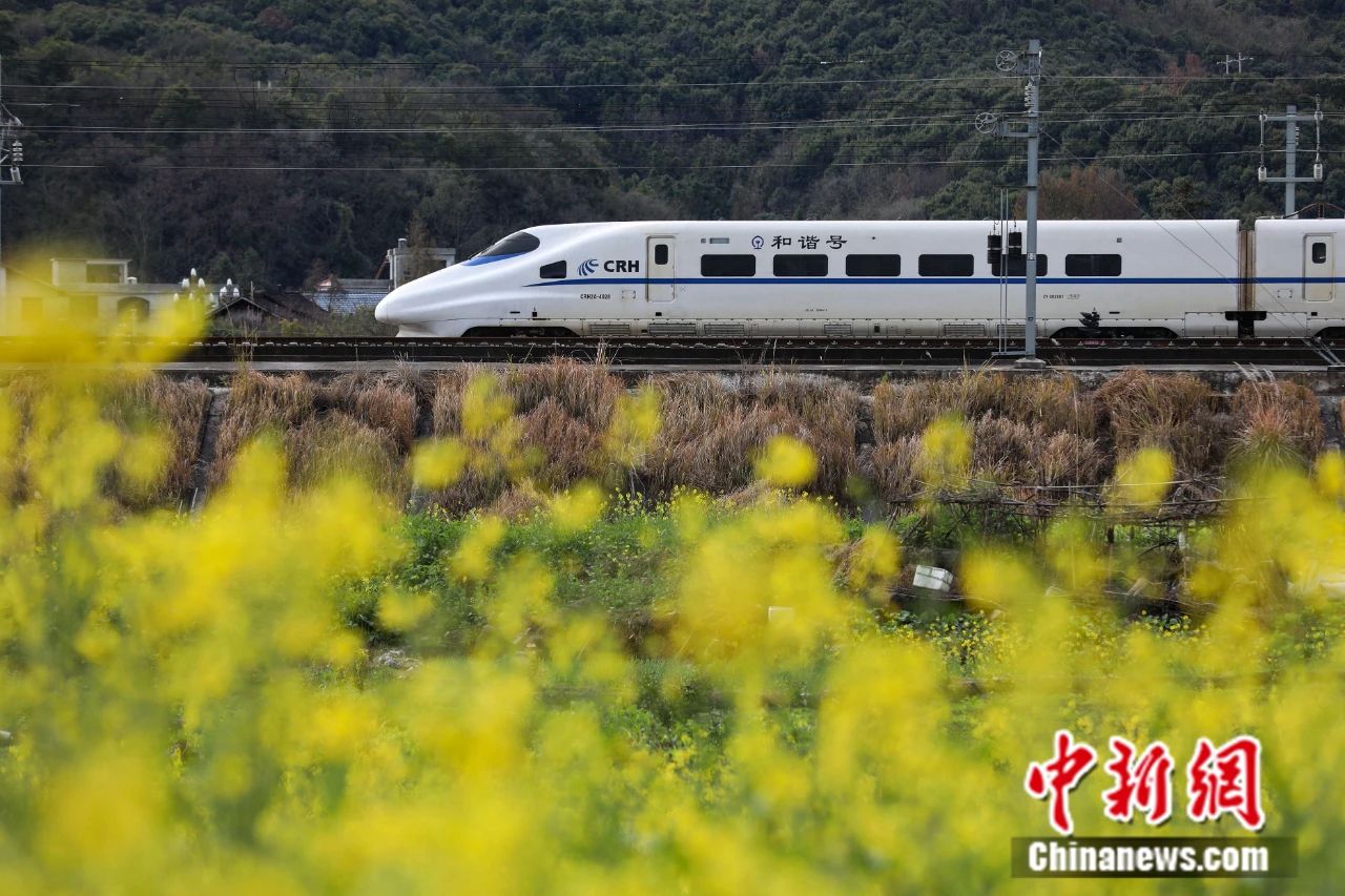 動車組列車從貴廣高鐵黔東南州從江縣境內的油菜花田旁駛過。中新社記者 瞿宏倫 攝