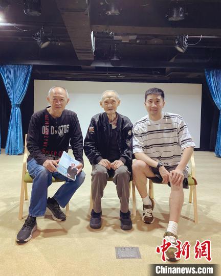 2023年5月8日,紀(jì)錄片《日暮·歸鄉(xiāng)》導(dǎo)演楊正濃與臺(tái)灣老兵金英次子金士杰(左一)、“感動(dòng)中國(guó)”人物高秉涵(中)在臺(tái)北交流。(片方供圖)