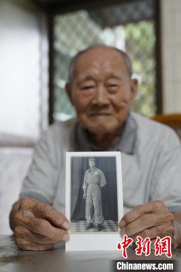 2018年5月21日,安徽合肥籍臺(tái)灣老兵金英在臺(tái)灣屏東家中為《日暮·歸鄉(xiāng)》劇組展示老照片。(片方供圖)
