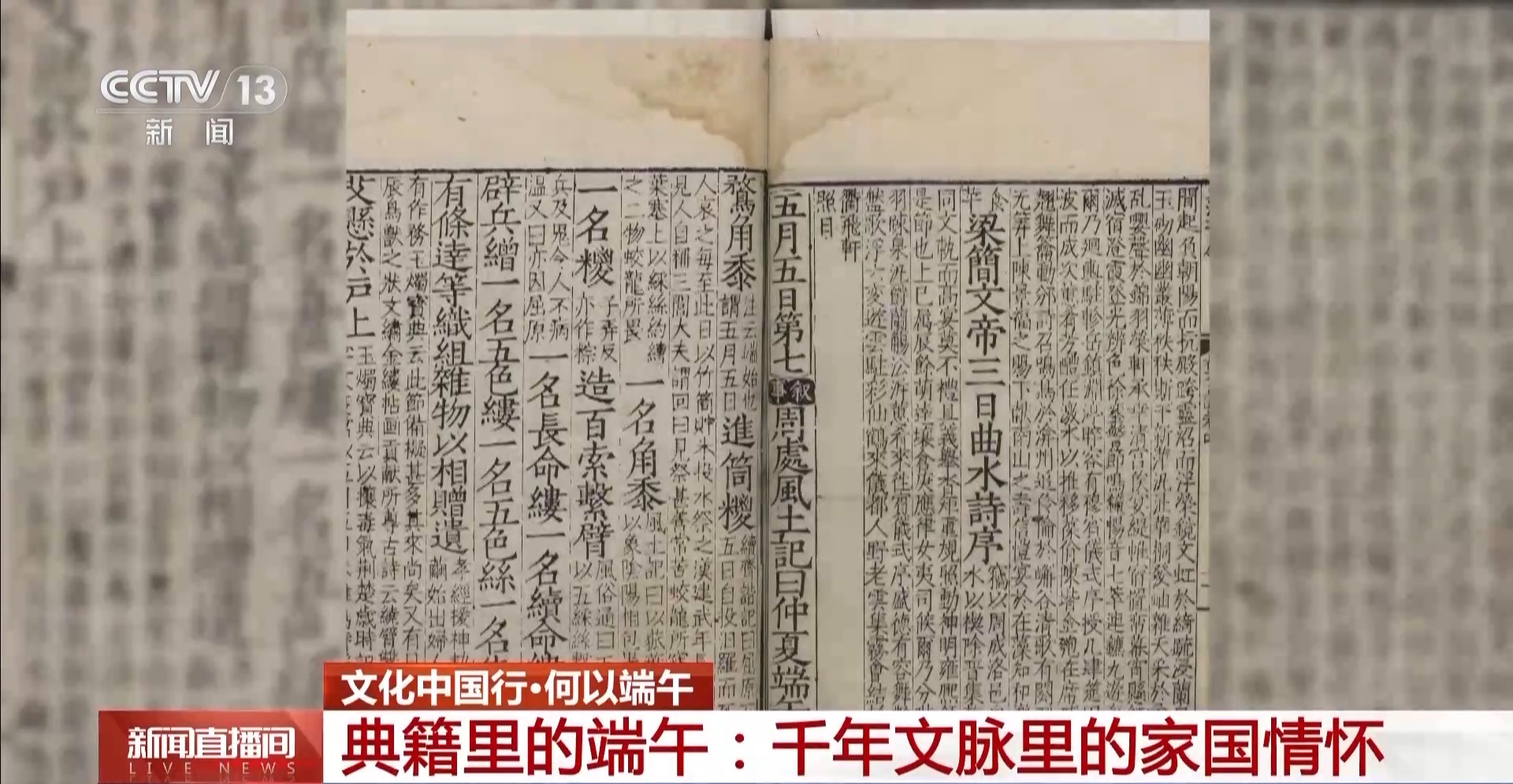 端午節(jié)是我國首個入選世界非物質(zhì)文化遺產(chǎn)的節(jié)日,既有獨(dú)特的自然物候特征,又有深厚的民族文化內(nèi)涵。從典籍里,我們?nèi)テ纷x端午,更能感受這種延續(xù)千年的自然風(fēng)貌和跨越古今的家國情懷。